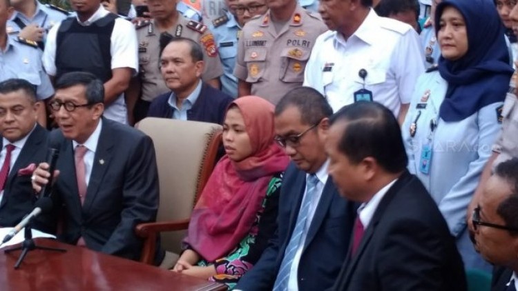 Ia didampingi oleh Menteri Hukum dan Hak Asasi Manusia (HAM), Yasonna Laoly, Dirjen Perlindungan Kemenkumham, Iqbal, dan Dirjen Administrasi Umum Kemenkumham, Cahyo.